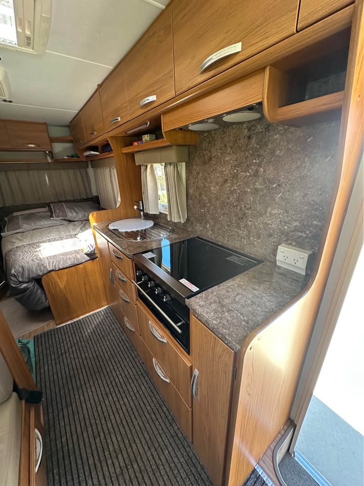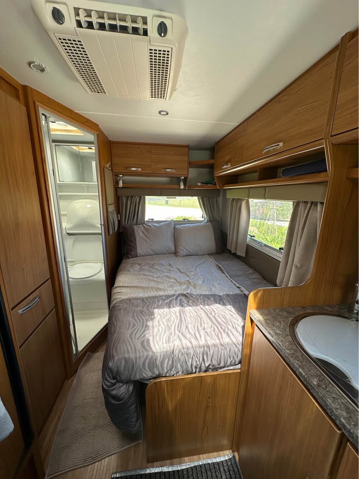 2011 Jayco Conquest FD 23-1 Touring Edition – Fiat Ducato 160 Multijet Automatic C-Class Motorhome, 4-berth, low kms (65,000km). Powered by a 3.0L turbo diesel engine with automatic transmission, 90L fuel tank, and GVM 4,005kg. Features leather seats, front swivel seats, rear view camera, reverse cycle air-conditioning, electric windows, 150W solar panel, 100Ah AGM battery, 2x 4kg gas bottles, 100L fresh water tank, grey water tank, mains pressure connection, 15A 240V inlet, wind-out awning, external power outlets and lights, drop-down picnic table, and electric entry step. Internal layout includes double bed, over-cab double bed with ladder and storage net, under-bed and overhead storage, hanging robe with drawers, café style dinette, and 12V lights to bed – perfect for touring and family adventures.