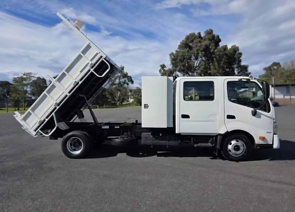 2012 HINO 300 717 Crew Cab Tipper – Low kms (83,629km), Drive Away – No More to Pay. Features 4 Cylinder Diesel Engine, 6-Speed Manual Transmission, 6x brand new tyres, serviced with genuine filters & oil, LED rotating beacons, reverse siren, lockable toolboxes in tray with keys, additional under-tray toolbox, tow bar, and LED work lights. Tare: 4,320kg | GVM: 6,500kg | GCM: 10,000kg | VIN: JHHNCT1H90K001295. Well-maintained, presents and drives like new – ready for work.