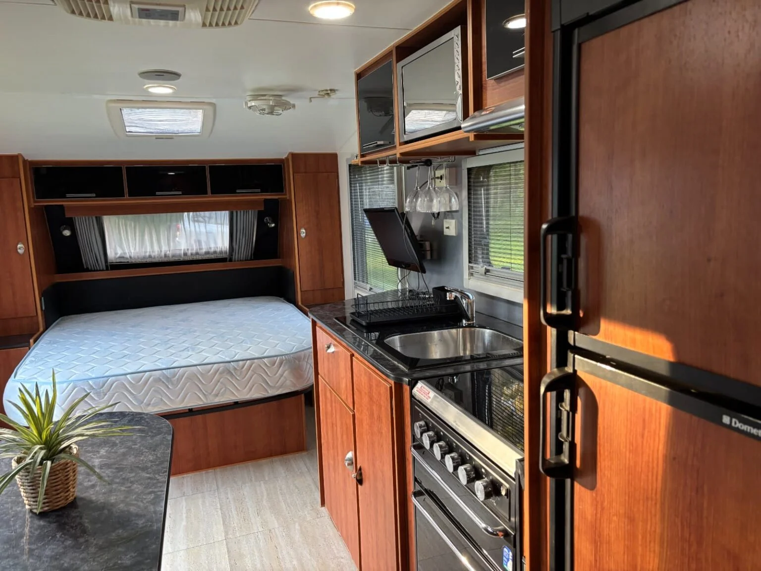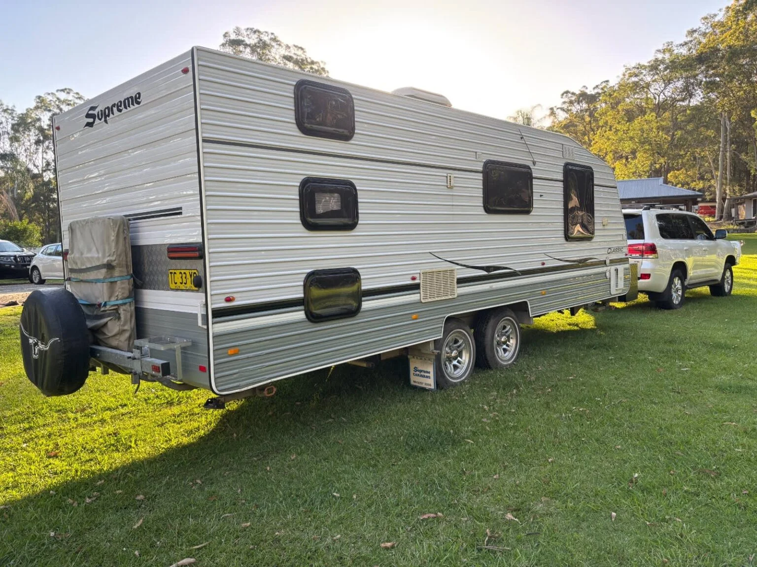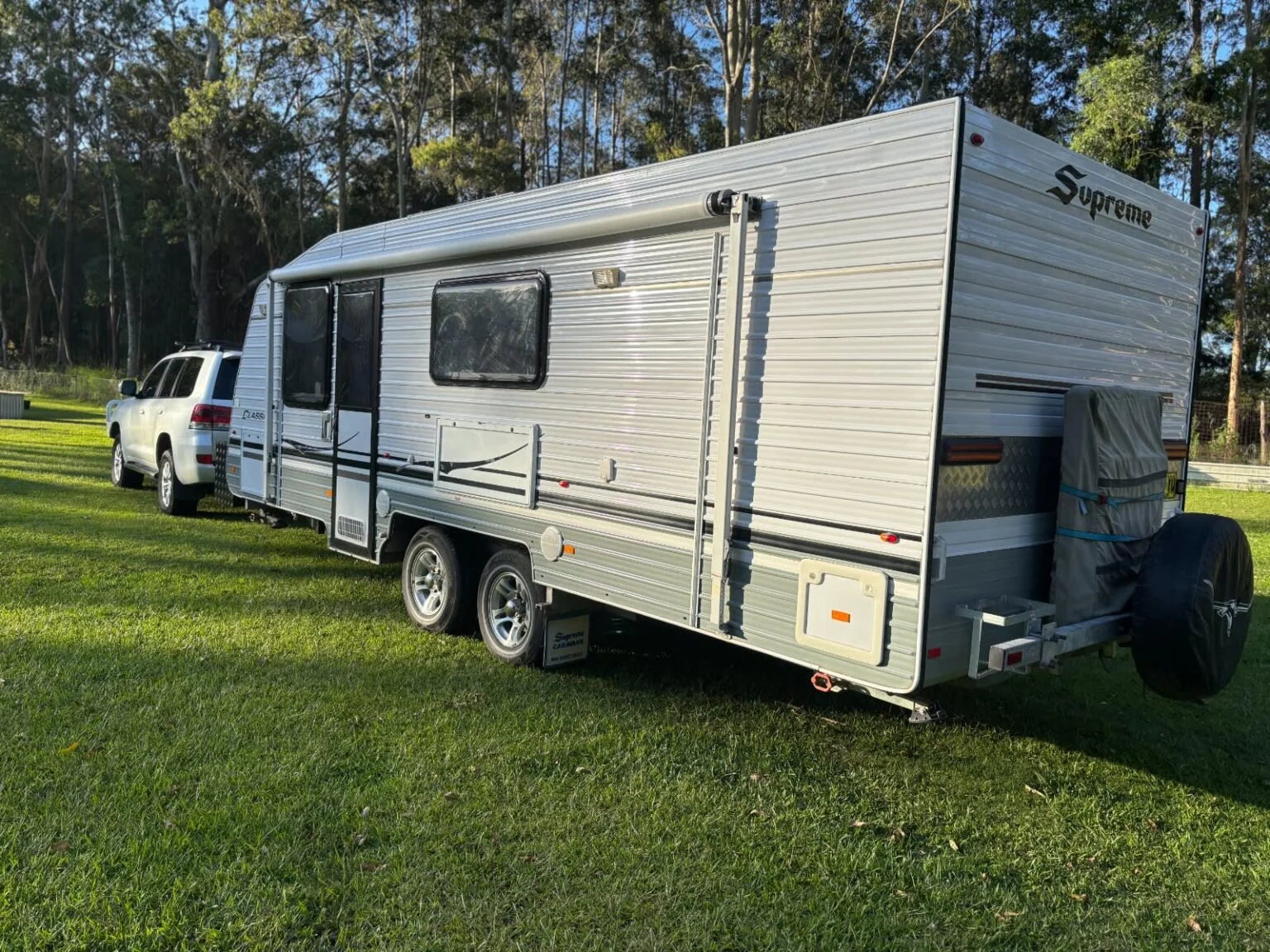 2013 Supreme Classic 23ft Family Caravan – Sleeps 5, Triple Bunks, Full Ensuite, Solar. Tare 2,226kg | ATM 2,626kg | Ball Weight 260kg | Tandem Axles | Water Capacity 160L. Well-maintained family touring caravan with queen bed, triple bunks, full ensuite, and spacious 23ft layout. Features solar system, dual water tanks, gas & electric hot water, washing machine, Dometic fridge/freezer, full kitchen, ample storage, external speakers, roll-out awning, full annex, tunnel boot, drawbar storage, generator and Weber Q2000 holders, side-wind jockey wheel, and included levelling ramps & hoses. Easy to tow, perfect for family adventures with both caravan park comfort and off-grid capability.