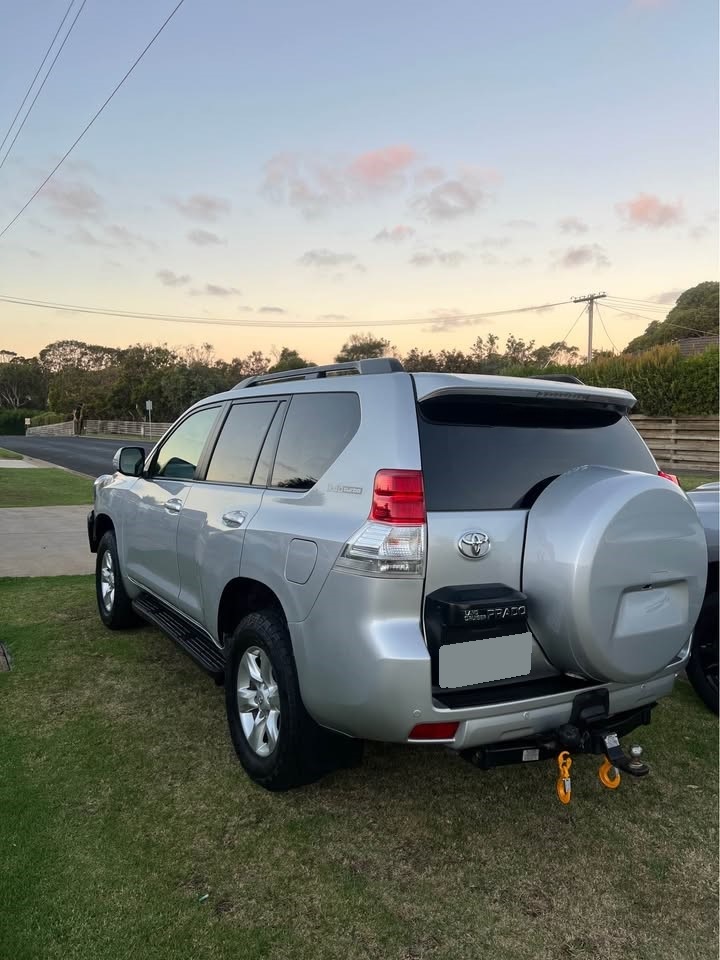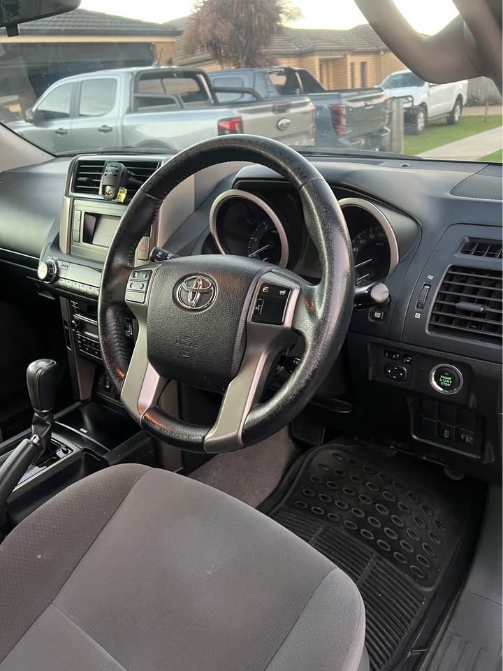 2013 Toyota Land Cruiser Prado GLX – 7 Seater, 212,000km, Automatic, Diesel. Features near-new tyres, long-range fuel tank, bullbar, tow bar, tinted windows, recently serviced, and freshly roadworthy. Exterior Silver, Interior Grey. Reliable, spacious and ready for both city and off-road adventures.