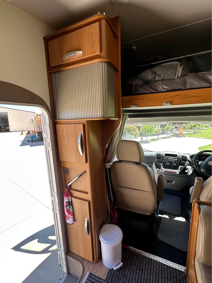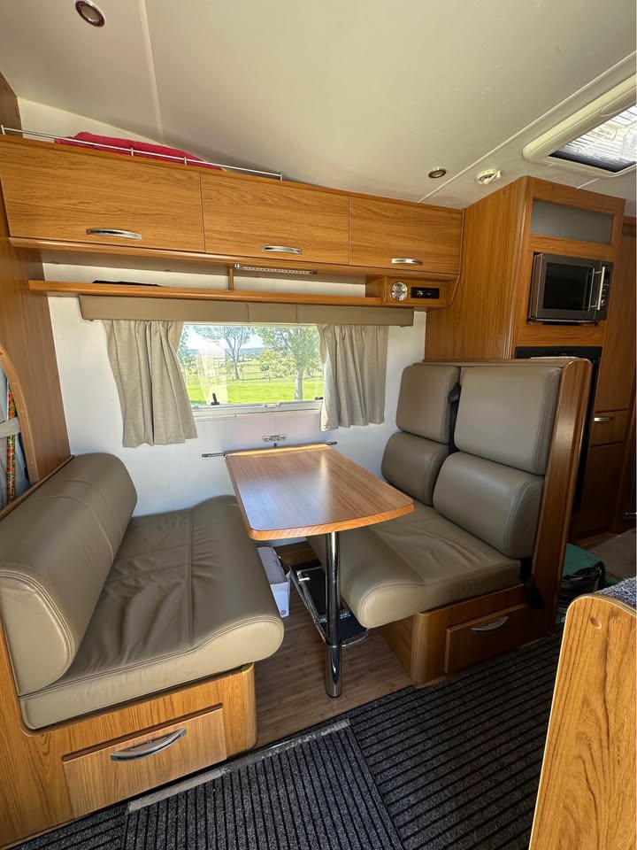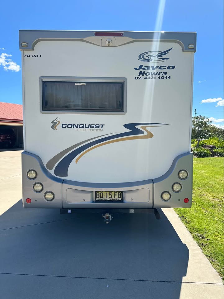 2011 Jayco Conquest FD 23-1 Touring Edition – Fiat Ducato 160 Multijet Automatic C-Class Motorhome, 4-berth, low kms (65,000km). Powered by a 3.0L turbo diesel engine with automatic transmission, 90L fuel tank, and GVM 4,005kg. Features leather seats, front swivel seats, rear view camera, reverse cycle air-conditioning, electric windows, 150W solar panel, 100Ah AGM battery, 2x 4kg gas bottles, 100L fresh water tank, grey water tank, mains pressure connection, 15A 240V inlet, wind-out awning, external power outlets and lights, drop-down picnic table, and electric entry step. Internal layout includes double bed, over-cab double bed with ladder and storage net, under-bed and overhead storage, hanging robe with drawers, café style dinette, and 12V lights to bed – perfect for touring and family adventures.