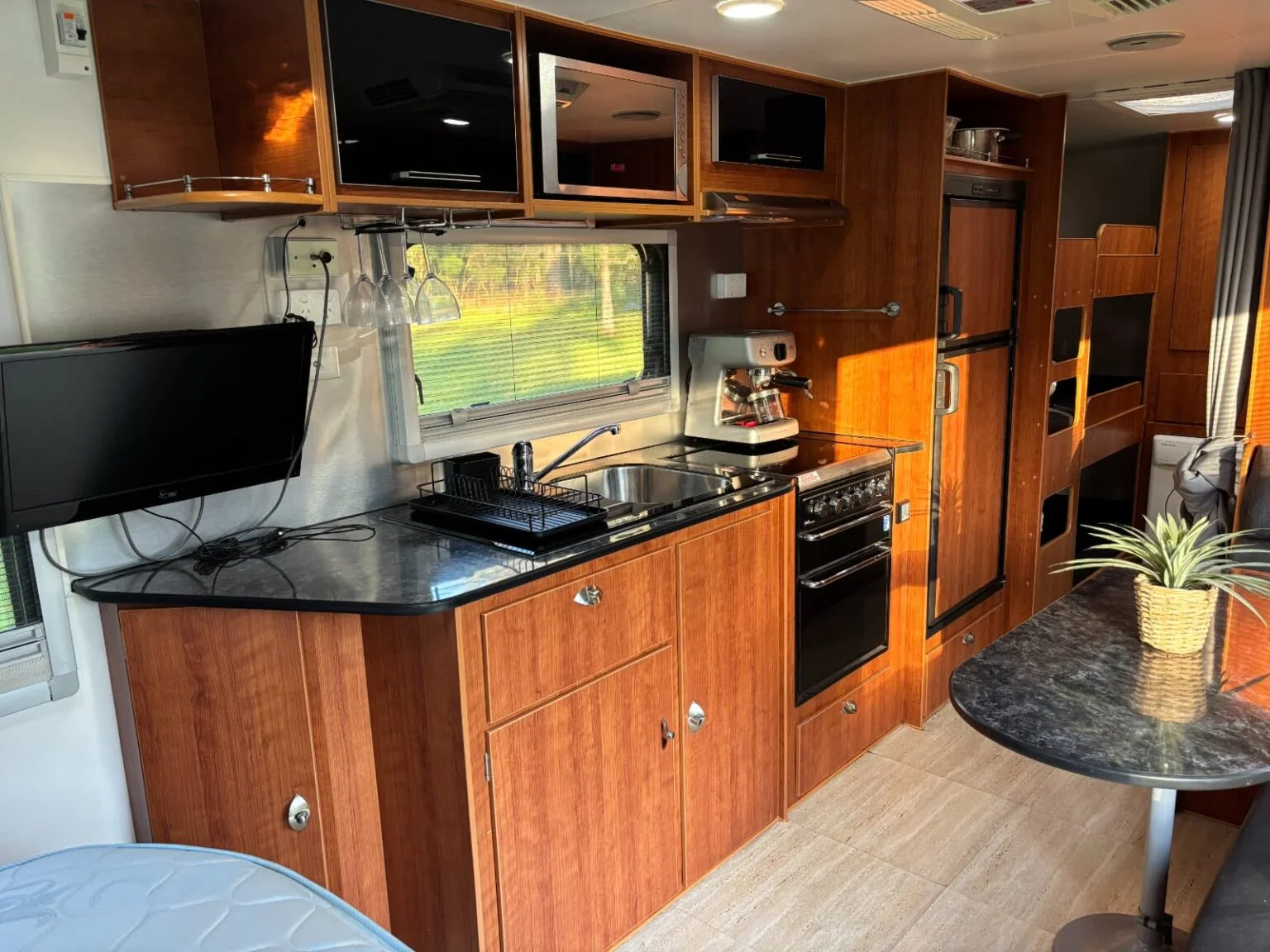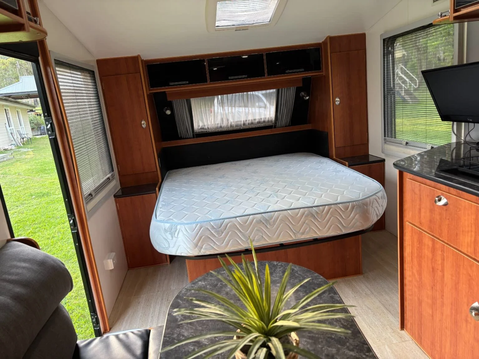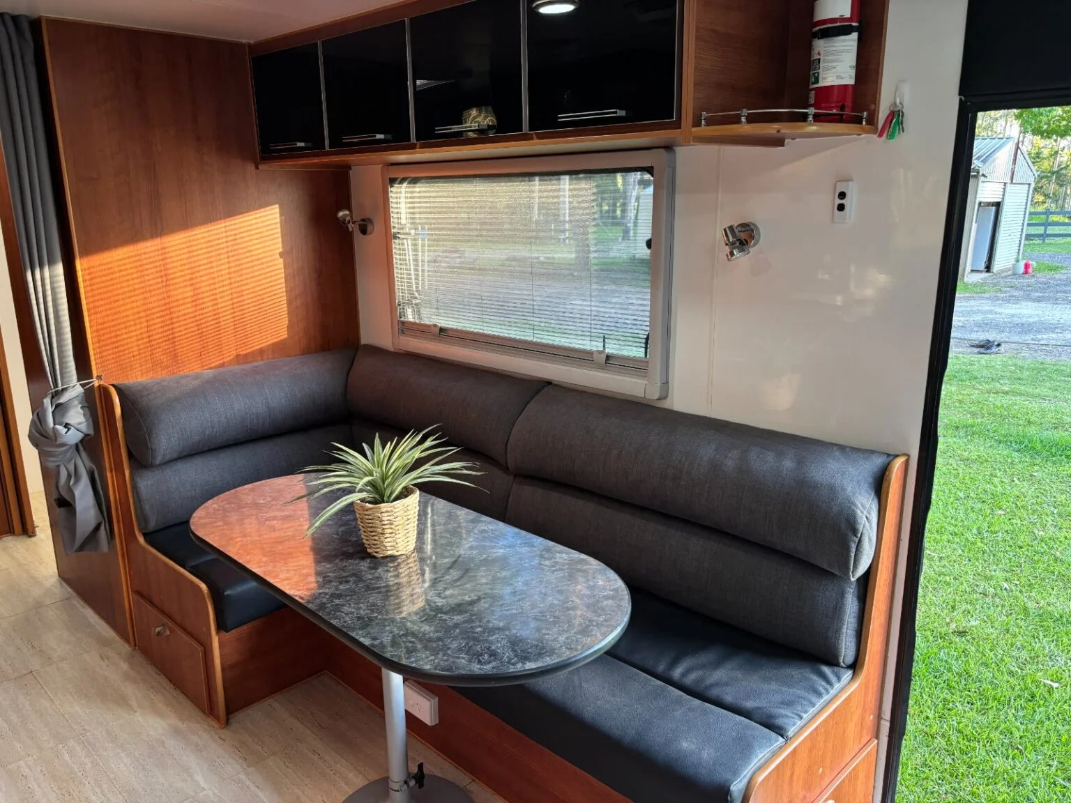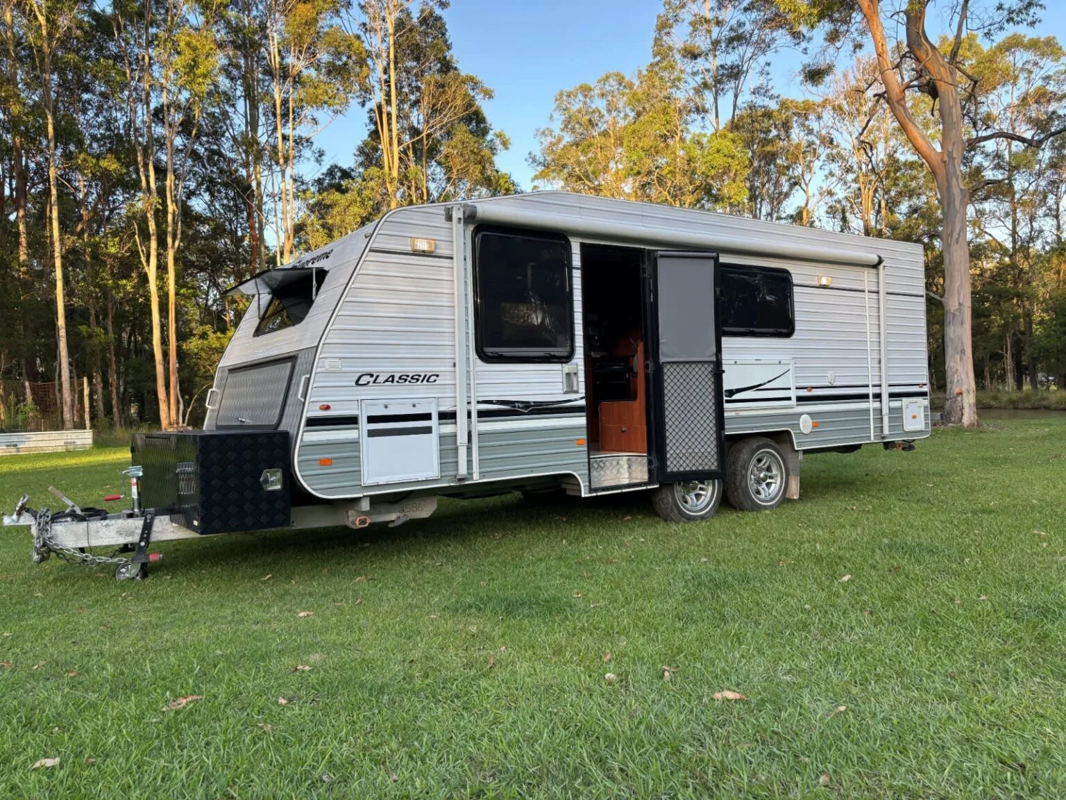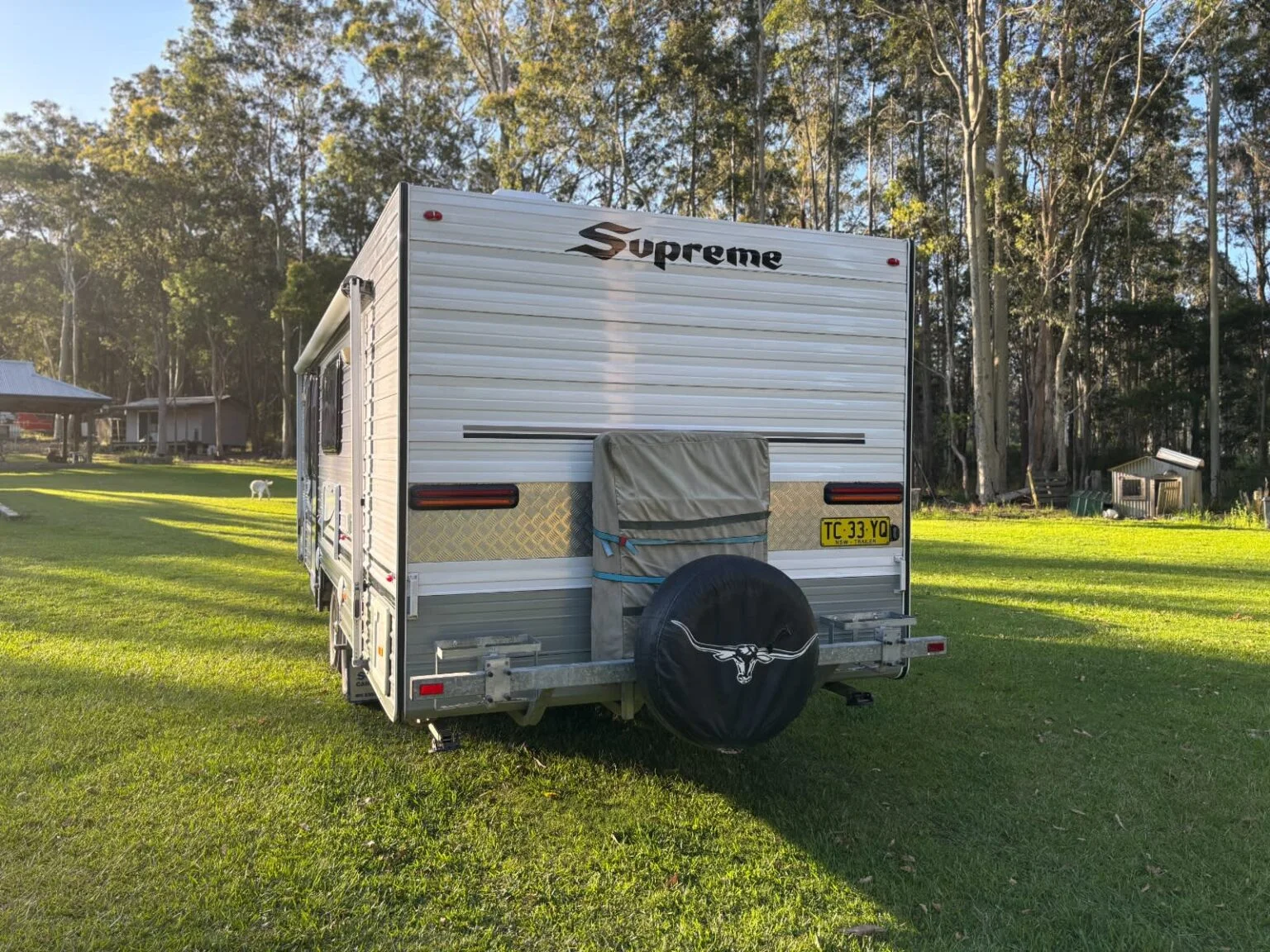 2013 Supreme Classic 23ft Family Caravan – Sleeps 5, Triple Bunks, Full Ensuite, Solar. Tare 2,226kg | ATM 2,626kg | Ball Weight 260kg | Tandem Axles | Water Capacity 160L. Well-maintained family touring caravan with queen bed, triple bunks, full ensuite, and spacious 23ft layout. Features solar system, dual water tanks, gas & electric hot water, washing machine, Dometic fridge/freezer, full kitchen, ample storage, external speakers, roll-out awning, full annex, tunnel boot, drawbar storage, generator and Weber Q2000 holders, side-wind jockey wheel, and included levelling ramps & hoses. Easy to tow, perfect for family adventures with both caravan park comfort and off-grid capability.