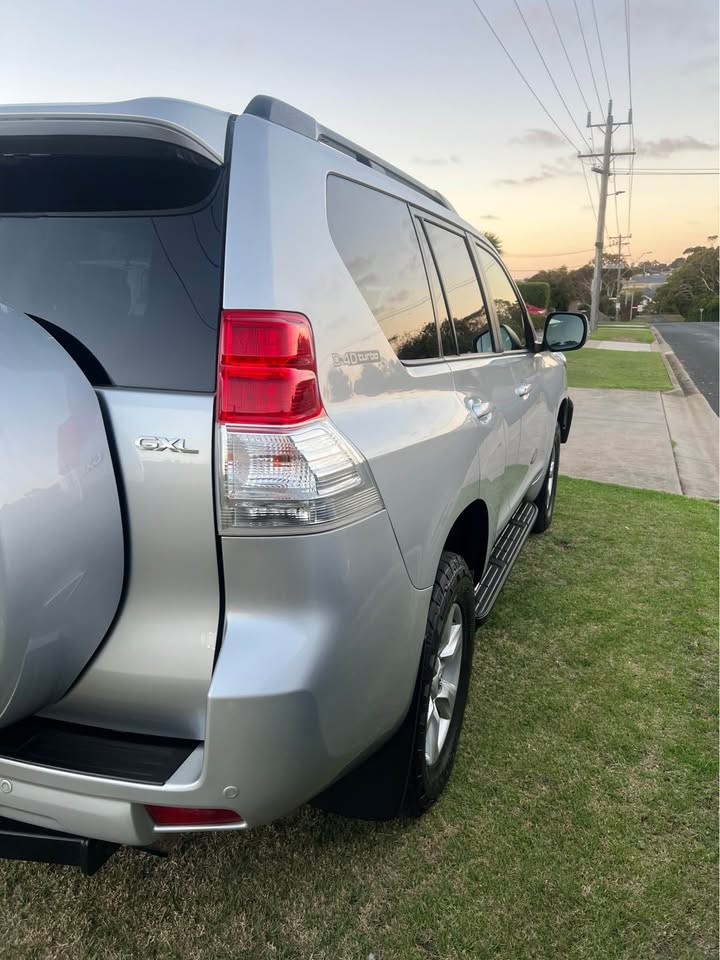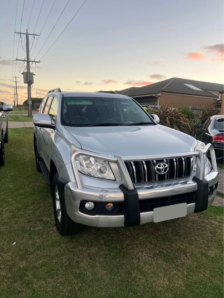 2013 Toyota Land Cruiser Prado GLX – 7 Seater, 212,000km, Automatic, Diesel. Features near-new tyres, long-range fuel tank, bullbar, tow bar, tinted windows, recently serviced, and freshly roadworthy. Exterior Silver, Interior Grey. Reliable, spacious and ready for both city and off-road adventures.